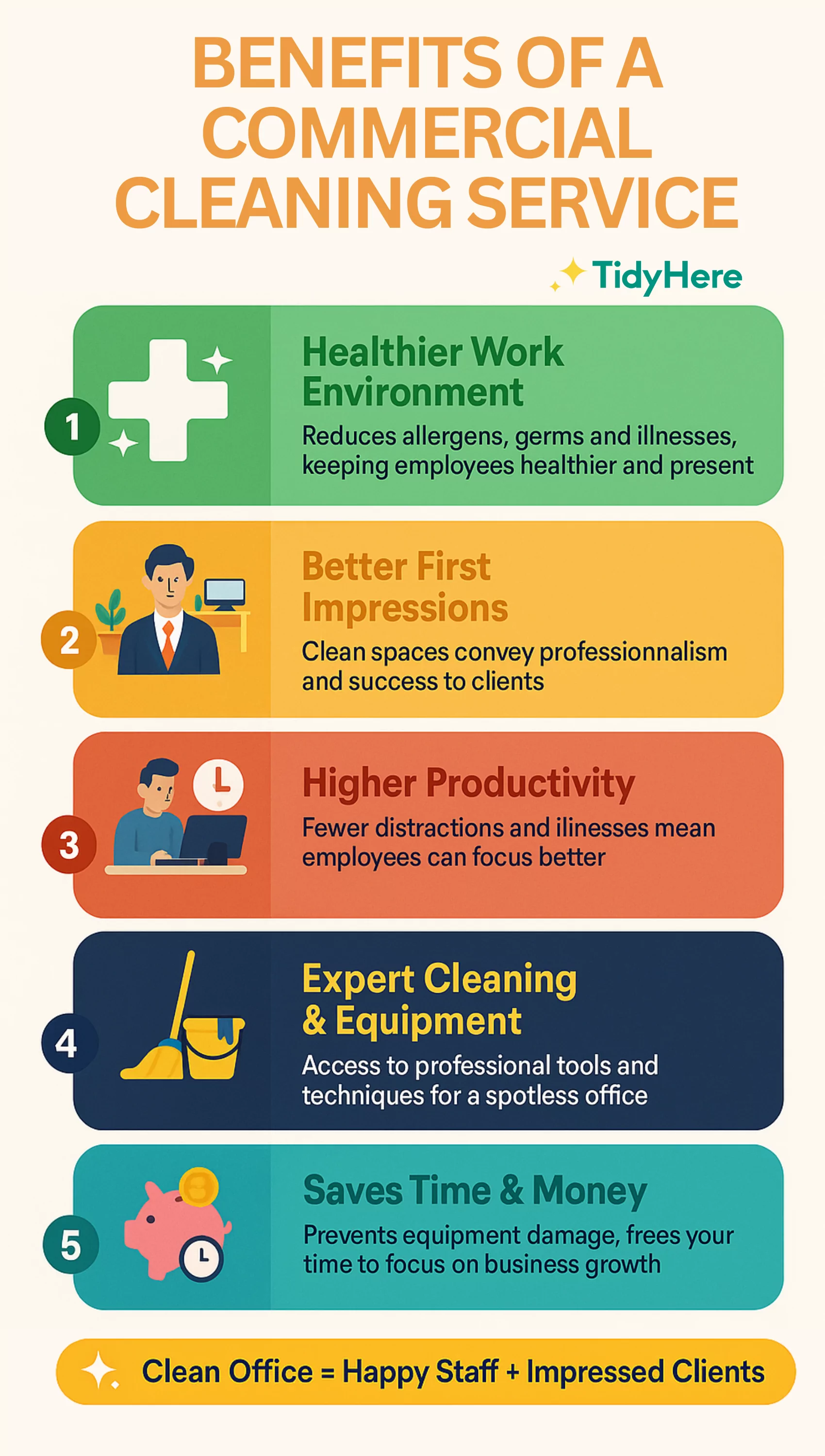 These benefits of using a commercial cleaning service can dramatically improve your business in exciting ways. Tidyhere is the trusted choice for office and commercial cleaning in Boston, and we can tailor our services to suit your specific needs. To book your first cleaning service with Tidyhere, contact us today.