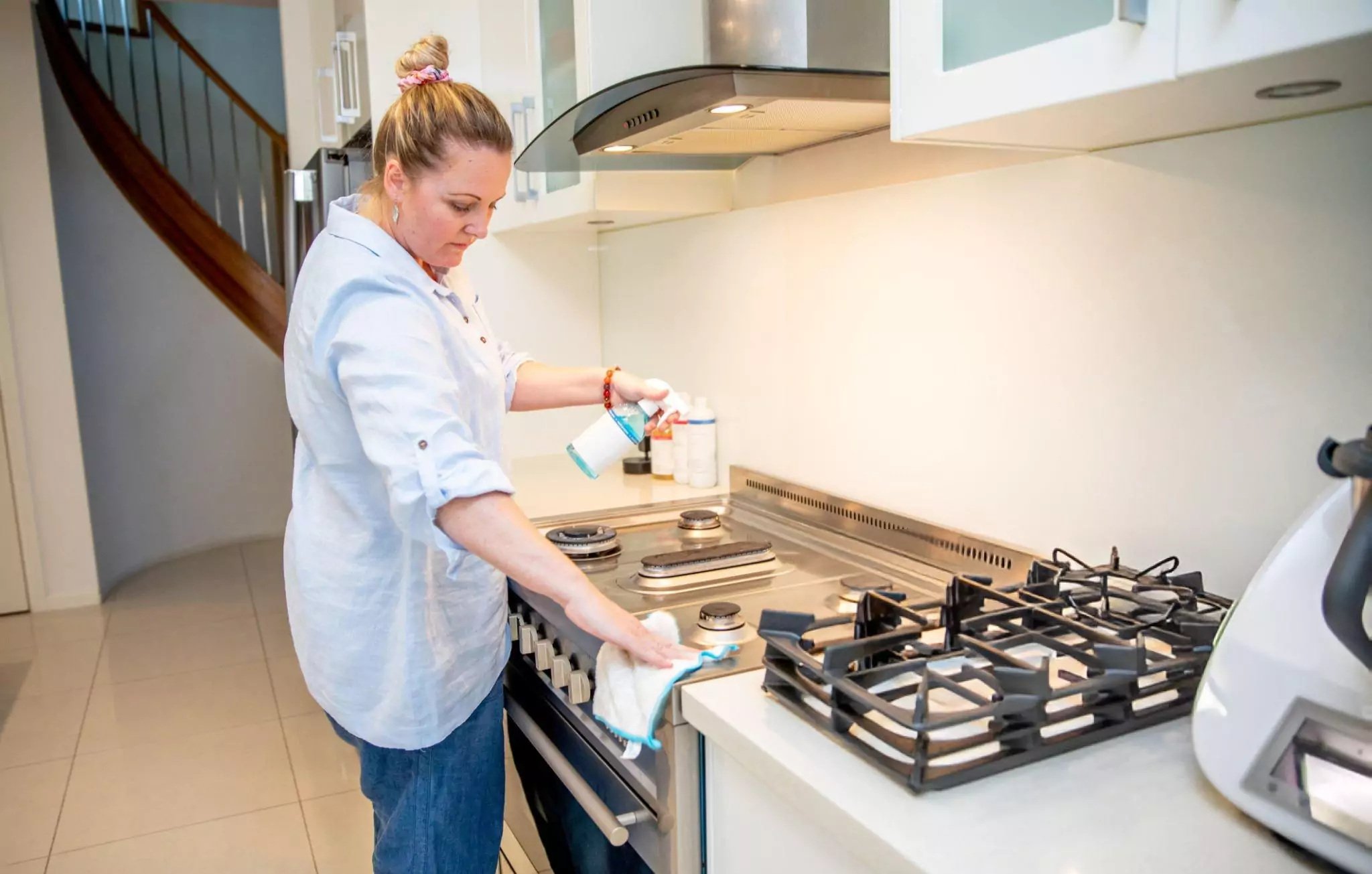To clean the sides of your stove, you typically have to carefully move the stove out of its nook to access it. While it’s pulled out, remember to wipe down the side of the cabinets.